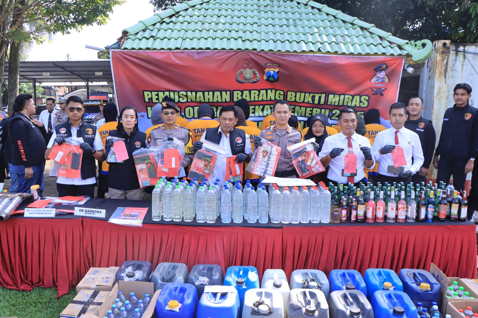 Polres Madiun saat konferensi pers pemusnahan barang bukti operasi pekat, berupa Miras.