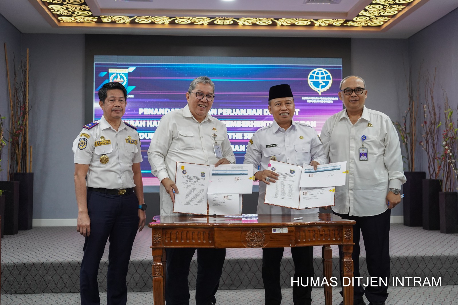 Depok, Jabar, ontimenusantara.com-Kementerian Perhubungan melalui Direktorat Jenderal Integrasi Transportasi dan Multimoda (Ditjen Intram) bersama Pemerintah Kota Depok menandatangani perjanjian hibah dan Berita Acara Serah Terima (BAST) hibah fasilitas pendukung Program Buy The Service (BTS), yang dikenal dengan nama Biskita Trans Depok. Penandatanganan berlangsung di Kantor Wali Kota Depok, dilakukan oleh Direktur Jenderal Integrasi Transportasi dan Multimoda, Risal Wasal, dan Wali Kota Depok, Supian Suri, serta disaksikan oleh Sekretaris Ditjen Intram, Dedy Cahyadi dan Kepala Dinas Perhubungan Kota Depok, Zamrowi.