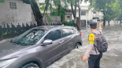 anggota polsek kembangan bantu arahkan kendaraan terjebak banjir